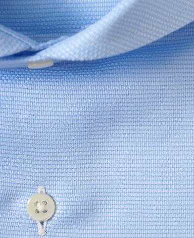 ■襟の表裏のパターンに差をつけ、コンパクトかつ構築的な襟を実現。品の良いドレスシャツの証である、首に巻きつくような内巻きフォルムは、匠によるいせ込み技術の成果です。