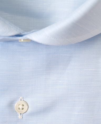 ■襟の表裏のパターンに差をつけ、コンパクトかつ構築的な襟を実現。品の良いドレスシャツの証である、首に巻きつくような内巻きフォルムは、匠によるいせ込み技術の成果です。