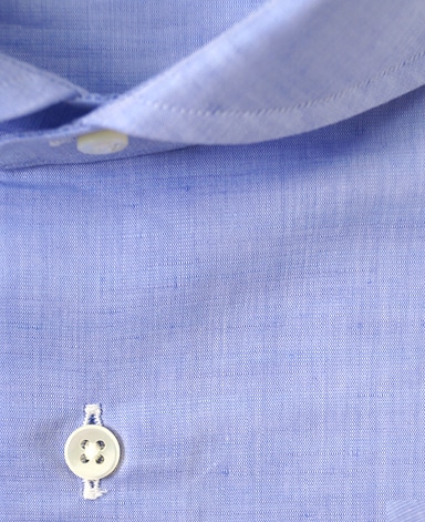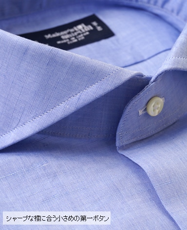 ■襟の表裏のパターンに差をつけ、コンパクトかつ構築的な襟を実現。品の良いドレスシャツの証である、首に巻きつくような内巻きフォルムは、匠によるいせ込み技術の成果です。