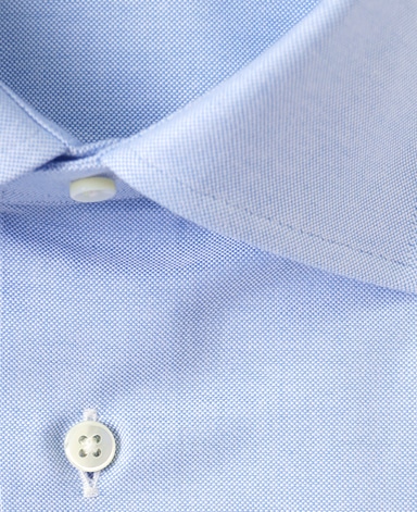 ■襟の表裏のパターンに差をつけ、コンパクトかつ構築的な襟を実現。品の良いドレスシャツの証である、首に巻きつくような内巻きフォルムは、匠によるいせ込み技術の成果です。