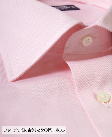 ■襟の表裏のパターンに差をつけ、コンパクトかつ構築的な襟を実現。品の良いドレスシャツの証である、首に巻きつくような内巻きフォルムは、匠によるいせ込み技術の成果です。