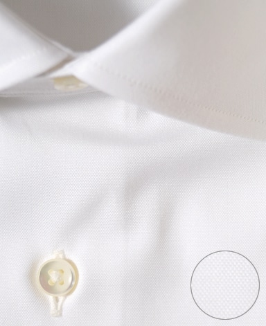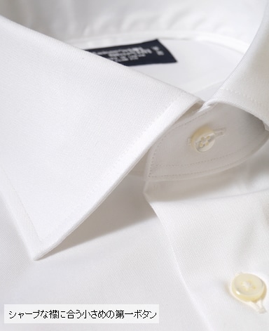 ■襟の表裏のパターンに差をつけ、コンパクトかつ構築的な襟を実現。品の良いドレスシャツの証である、首に巻きつくような内巻きフォルムは、匠によるいせ込み技術の成果です。
