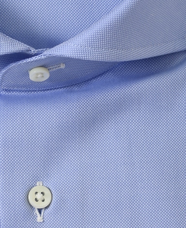 ■襟の表裏のパターンに差をつけ、コンパクトかつ構築的な襟を実現。品の良いドレスシャツの証である、首に巻きつくような内巻きフォルムは、匠によるいせ込み技術の成果です。