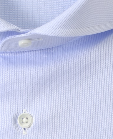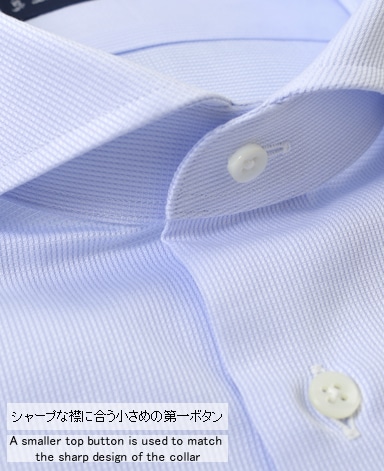 ■襟の表裏のパターンに差をつけ、コンパクトかつ構築的な襟を実現。品の良いドレスシャツの証である、首に巻きつくような内巻きフォルムは、匠によるいせ込み技術の成果です。