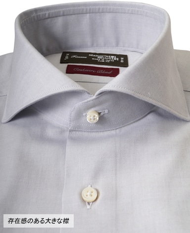 通常のシャツより襟にボリュームが出て、襟元に新しい表情を見せてくれる。