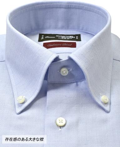 通常のシャツより襟にボリュームが出て、襟元に新しい表情を見せてくれる。