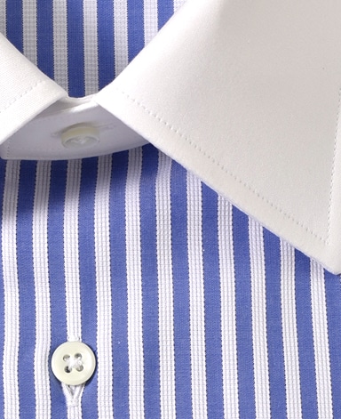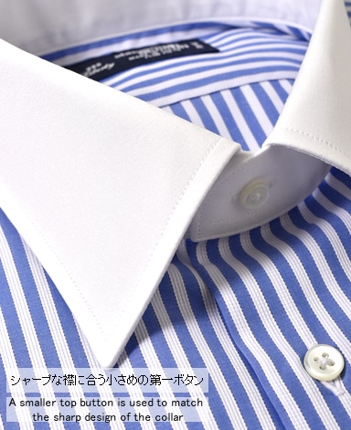 ■襟の表裏のパターンに差をつけ、コンパクトかつ構築的な襟を実現。品の良いドレスシャツの証である、首に巻きつくような内巻きフォルムは、匠によるいせ込み技術の成果です。