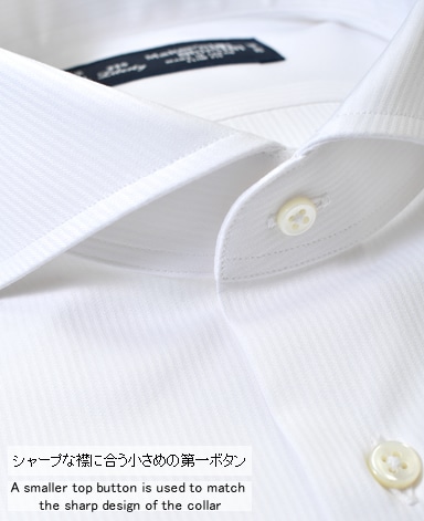 ■襟の表裏のパターンに差をつけ、コンパクトかつ構築的な襟を実現。品の良いドレスシャツの証である、首に巻きつくような内巻きフォルムは、匠によるいせ込み技術の成果です。