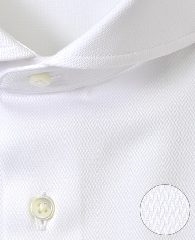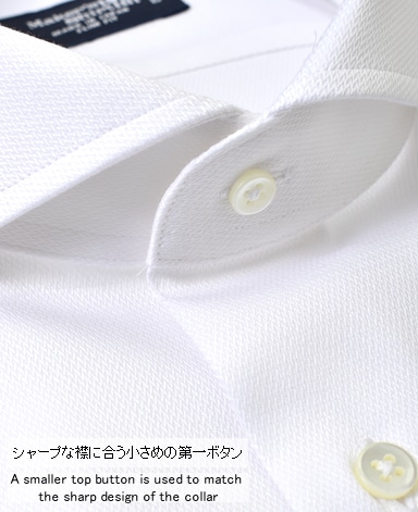 ■襟の表裏のパターンに差をつけ、コンパクトかつ構築的な襟を実現。品の良いドレスシャツの証である、首に巻きつくような内巻きフォルムは、匠によるいせ込み技術の成果です。
