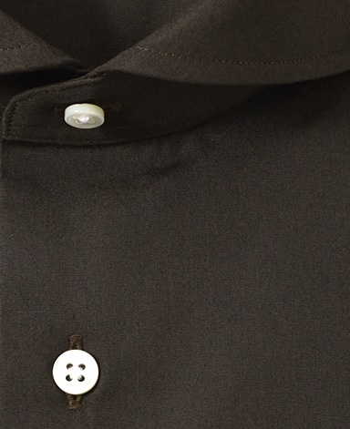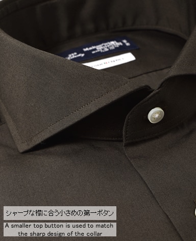 ■襟の表裏のパターンに差をつけ、コンパクトかつ構築的な襟を実現。品の良いドレスシャツの証である、首に巻きつくような内巻きフォルムは、匠によるいせ込み技術の成果です。