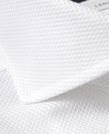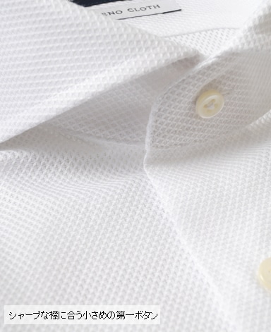 ■襟の表裏のパターンに差をつけ、コンパクトかつ構築的な襟を実現。品の良いドレスシャツの証である、首に巻きつくような内巻きフォルムは、匠によるいせ込み技術の成果です。