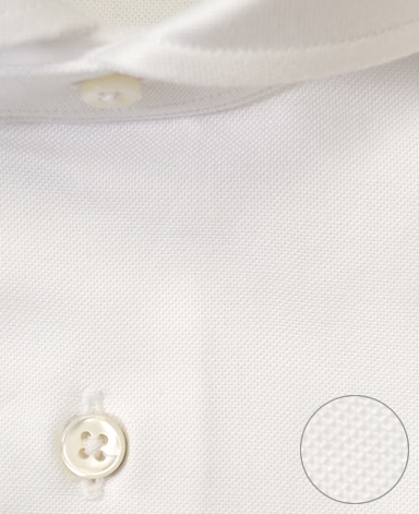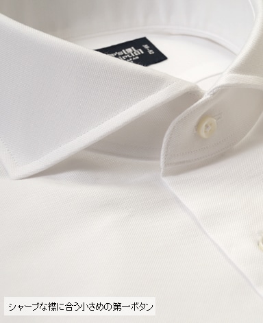 ■襟の表裏のパターンに差をつけ、コンパクトかつ構築的な襟を実現。品の良いドレスシャツの証である、首に巻きつくような内巻きフォルムは、匠によるいせ込み技術の成果です。