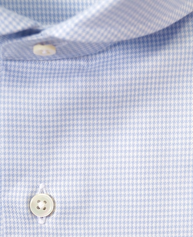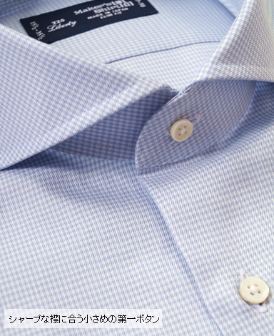 ■襟の表裏のパターンに差をつけ、コンパクトかつ構築的な襟を実現。品の良いドレスシャツの証である、首に巻きつくような内巻きフォルムは、匠によるいせ込み技術の成果です。