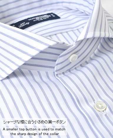 ■襟の表裏のパターンに差をつけ、コンパクトかつ構築的な襟を実現。品の良いドレスシャツの証である、首に巻きつくような内巻きフォルムは、匠によるいせ込み技術の成果です。