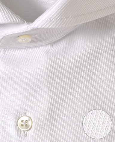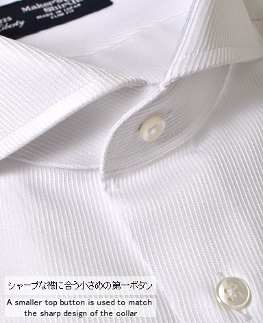 ■襟の表裏のパターンに差をつけ、コンパクトかつ構築的な襟を実現。品の良いドレスシャツの証である、首に巻きつくような内巻きフォルムは、匠によるいせ込み技術の成果です。