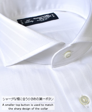 ■襟の表裏のパターンに差をつけ、コンパクトかつ構築的な襟を実現。品の良いドレスシャツの証である、首に巻きつくような内巻きフォルムは、匠によるいせ込み技術の成果です。