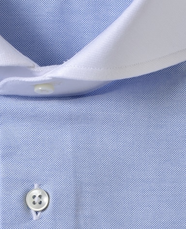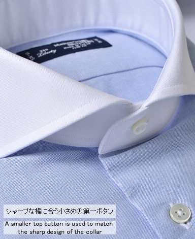 ■襟の表裏のパターンに差をつけ、コンパクトかつ構築的な襟を実現。品の良いドレスシャツの証である、首に巻きつくような内巻きフォルムは、匠によるいせ込み技術の成果です。