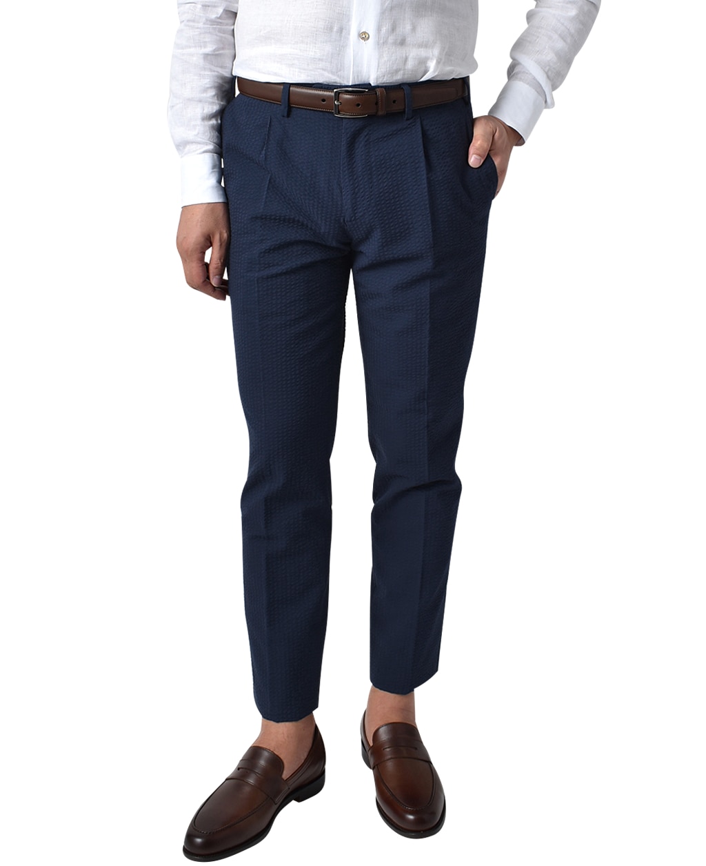 トラウザーズをワンプリーツ仕様にすることで、今期風のディテールを取り入れたセットアップになっています。