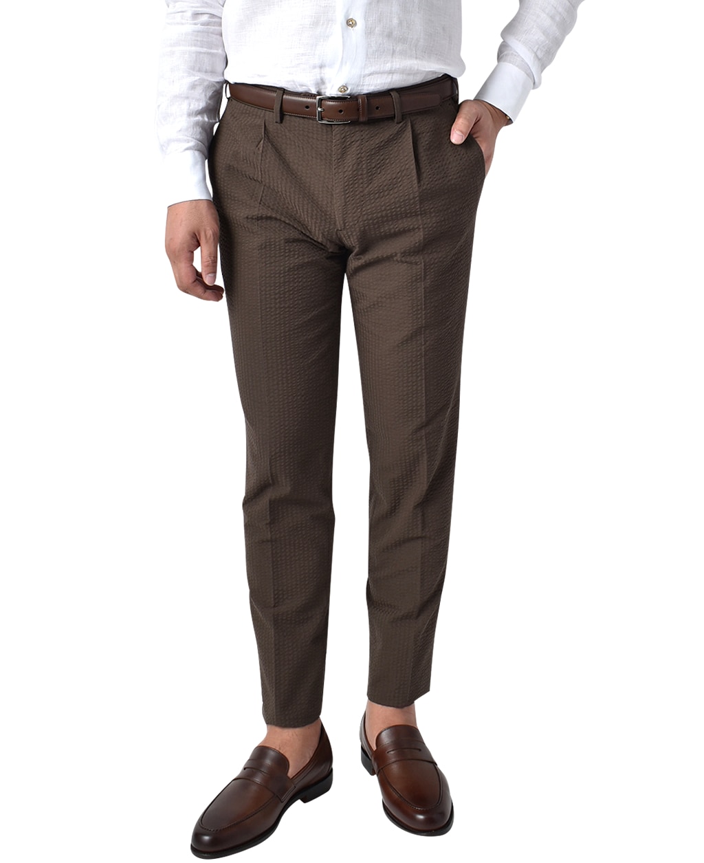 トラウザーズをワンプリーツ仕様にすることで、今期風のディテールを取り入れたセットアップになっています。
