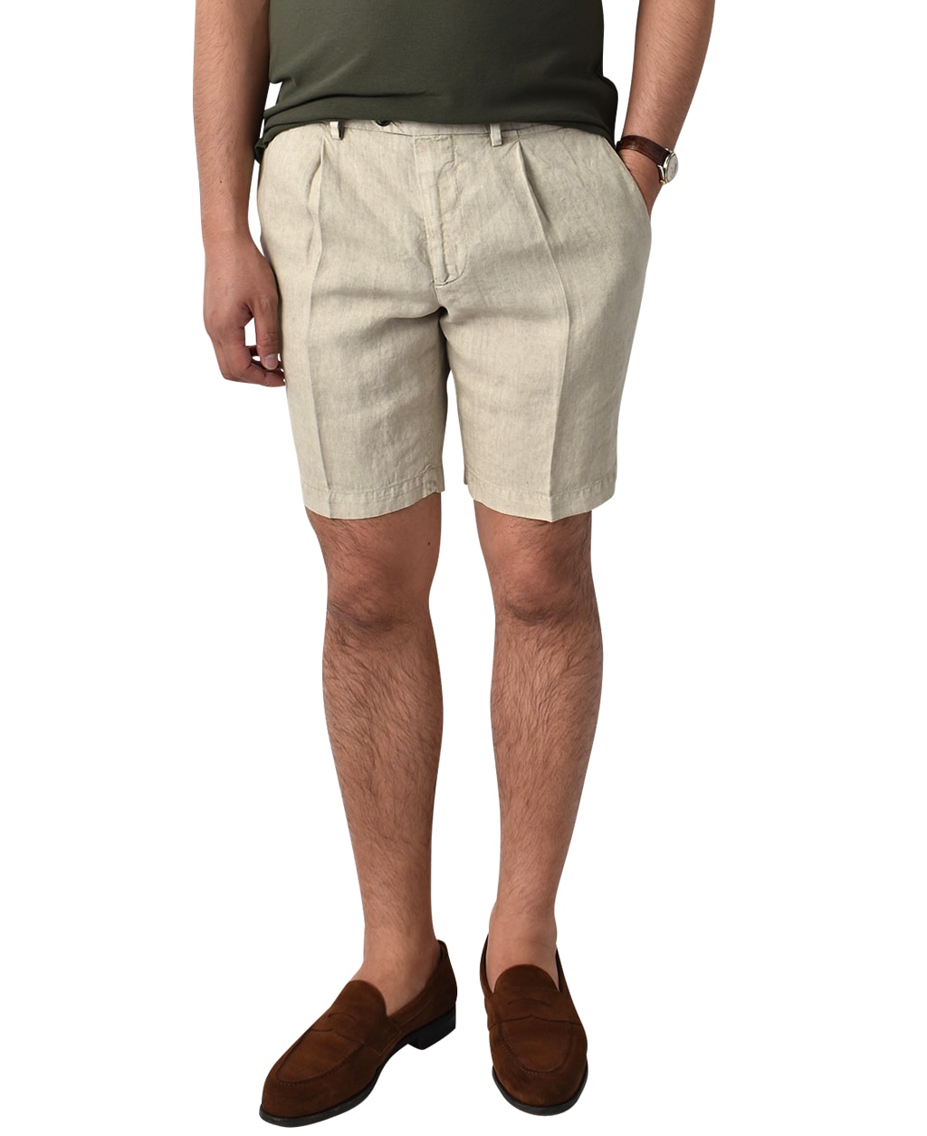 リネン素材を採用したショートパンツが登場。注目の1プリーツ仕様を取り入れ、リラックス感も抜群。