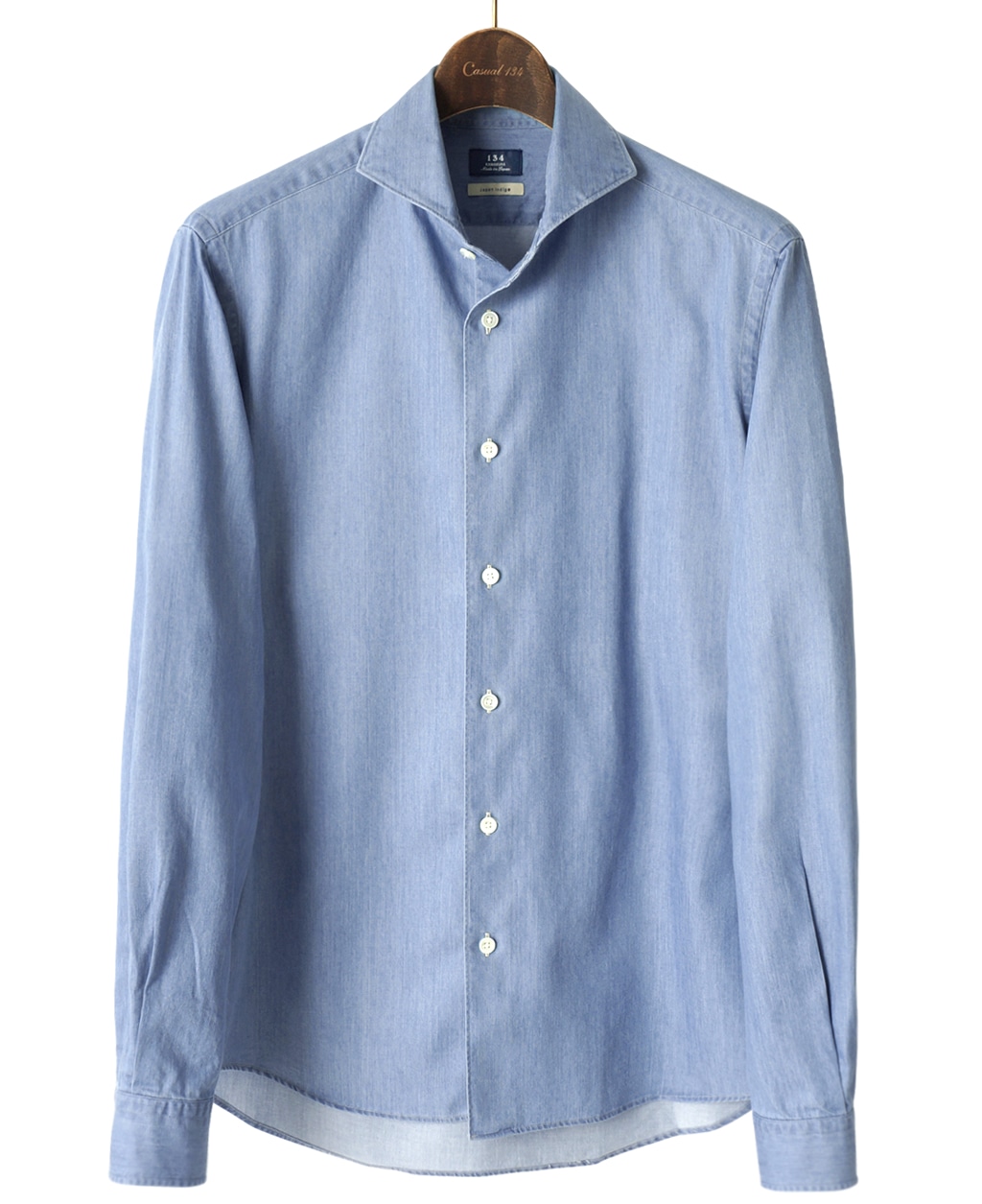 カジュアル134シャツより新しいシルエットが誕生。ウエストをシェイプしバックスタイルを背ダーツ仕様にすることですっきりとしたデザインになりました。