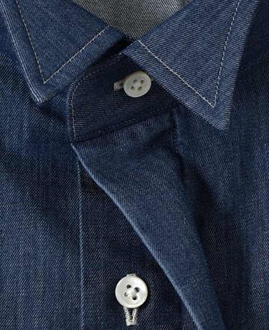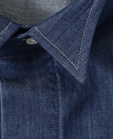 ■襟の表裏のパターンに差をつけ、コンパクトかつ構築的な襟を実現。品の良いドレスシャツの証である、首に巻きつくような内巻きフォルムは、匠によるいせ込み技術の成果です。