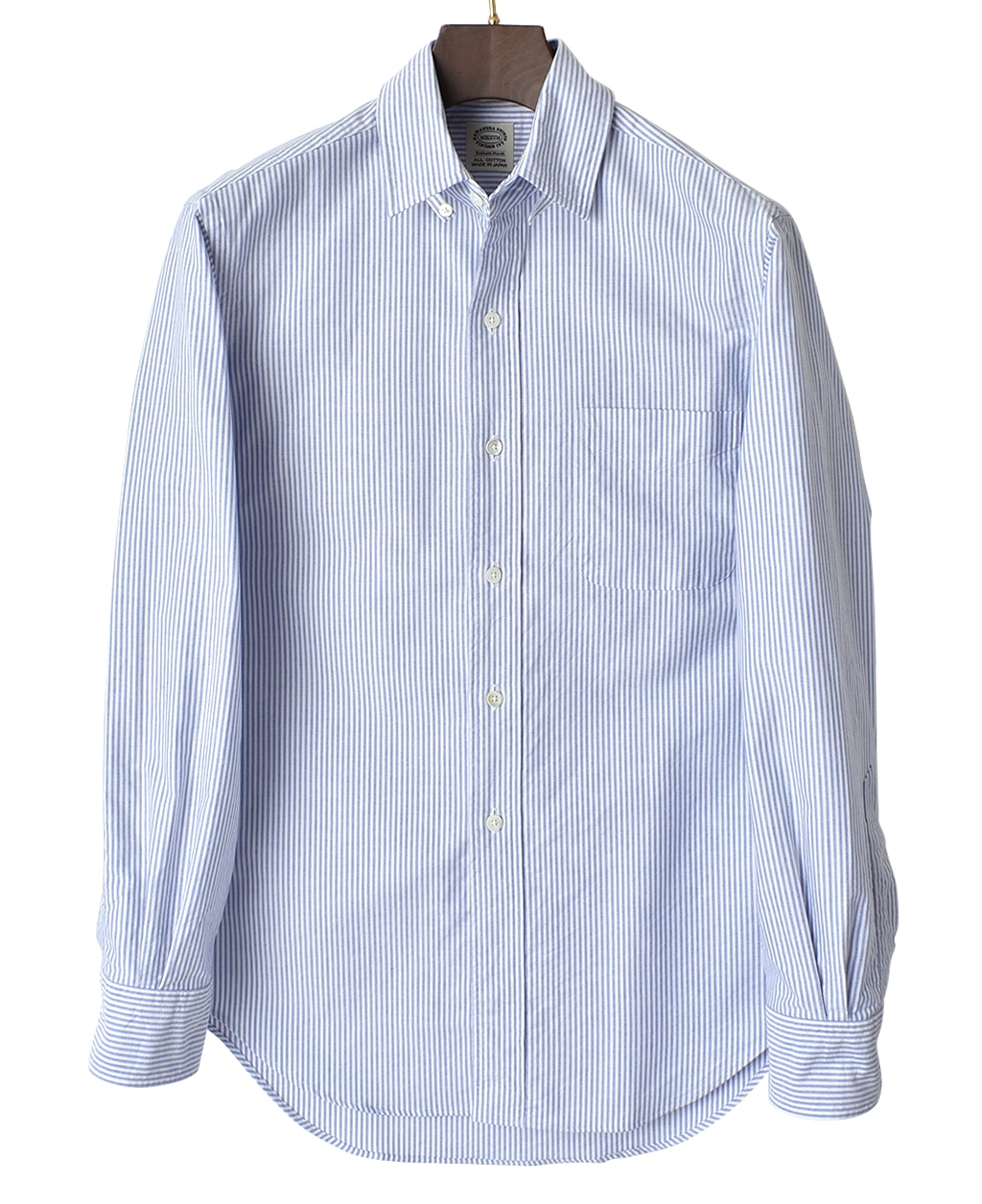 「1960年代、グリニッチ・ヴィレッジでビリヤードをやるようなスタイリッシュな人間は、こんなブルーストライプオックスのタブカラーシャツを着ていた。3つボタンのアイビースーツの下に、ナローなブラックシルクニットタイを合わせればコーディネートは完璧。このような襟は、最近めったに見なくなったが鎌倉シャツから自信をもっておすすめする。」