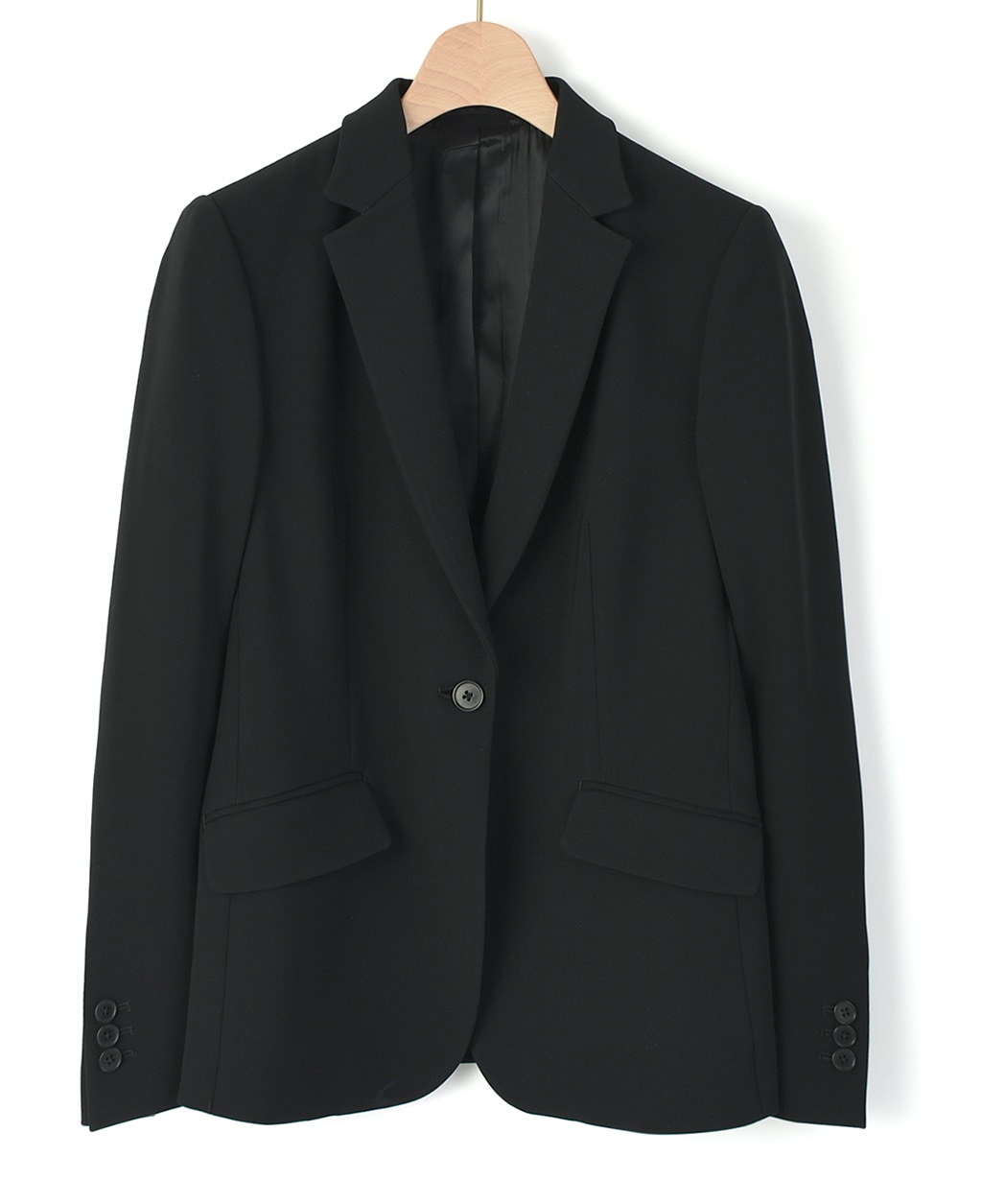 高めの位置の一つボタンは、ウエスト位置を高く見せ、スタイルアップに。