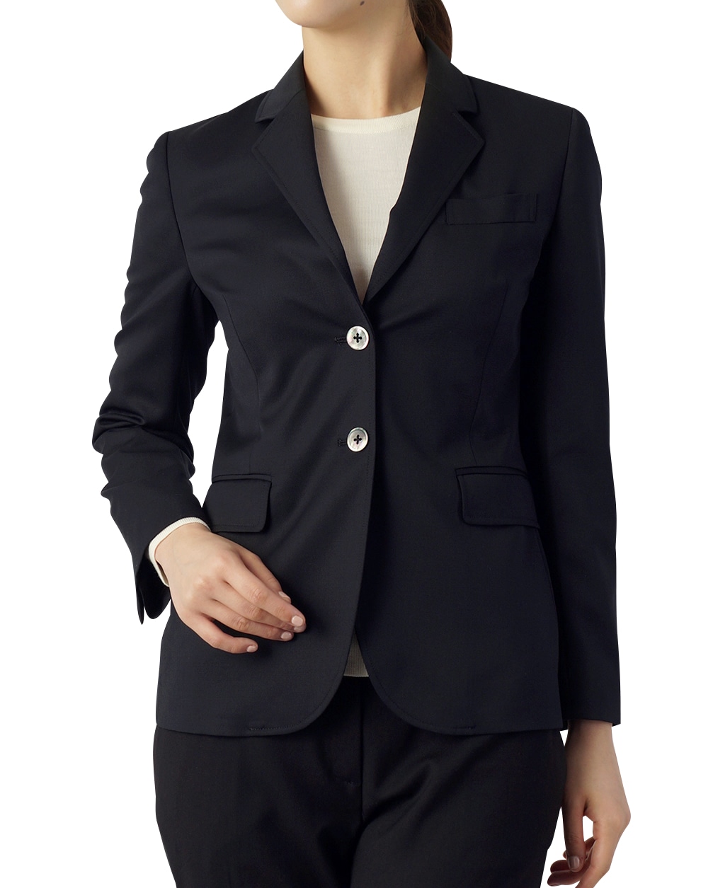 美しく輝く天然の貝からボタンを作製、女性らしさを引き立てます。