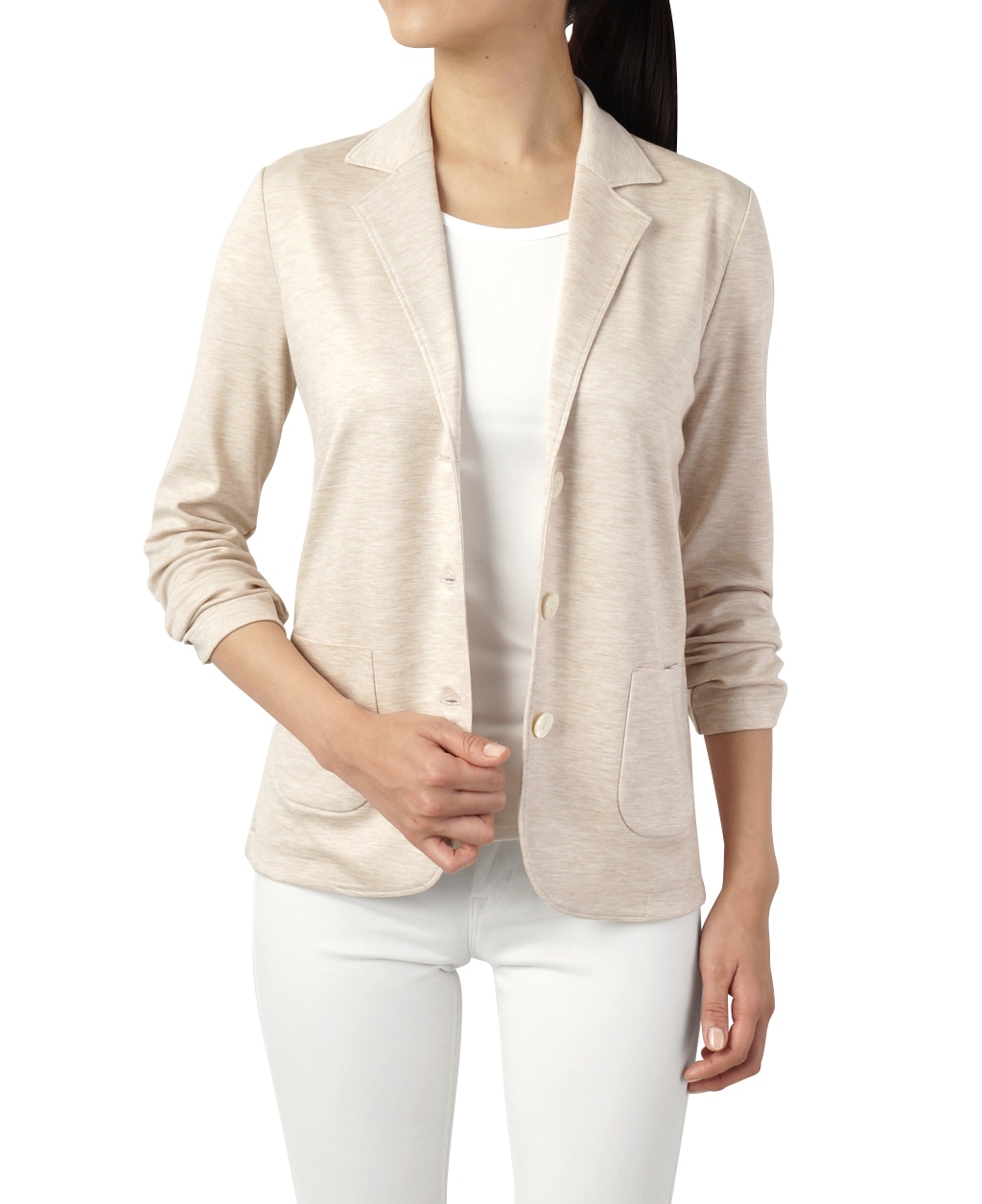 カーディガン感覚でラフに着こなせる素材感でありながら、テーラード仕立てのきちんと感も兼ね備えた、